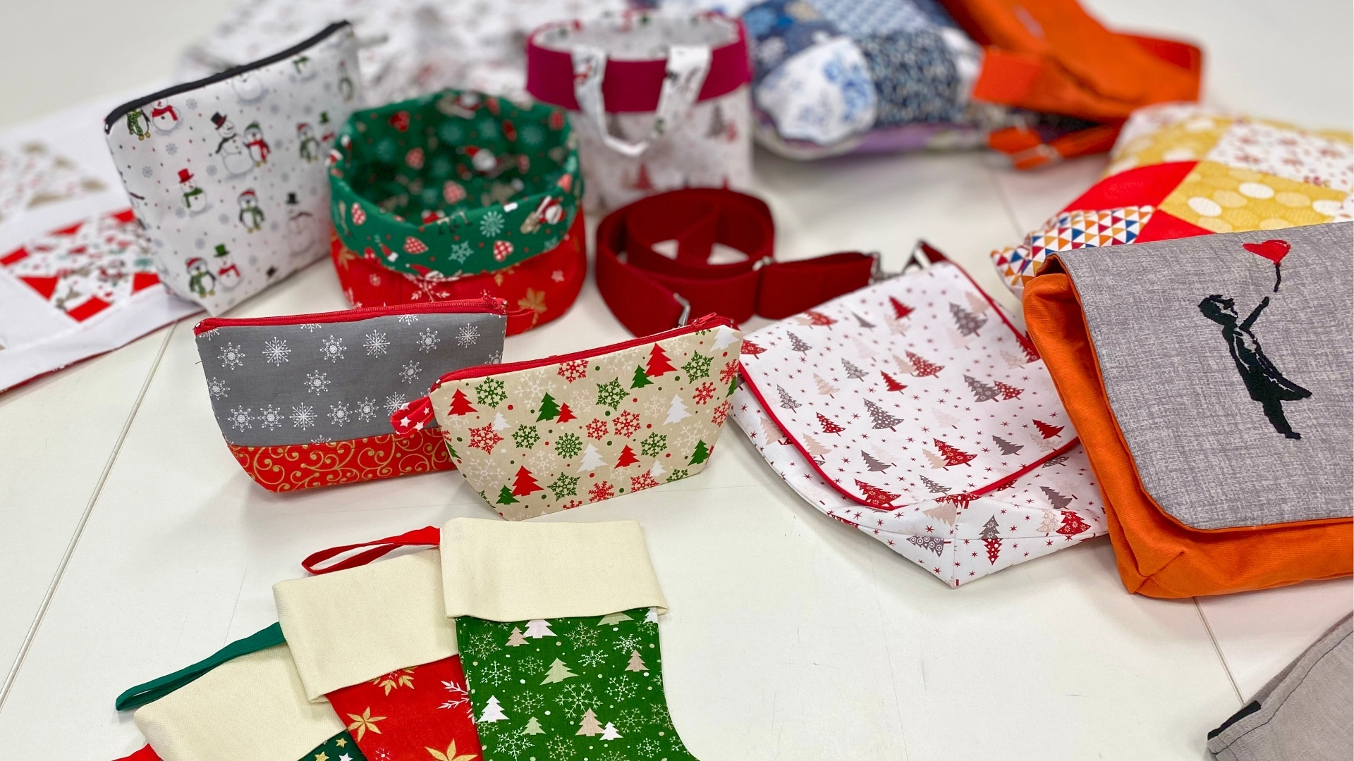 Schönes und Nützliches aus Stoff, beispielsweise Weihnachtssocken, Kosmetiktaschen, Nackenhörnchen u. v. m.